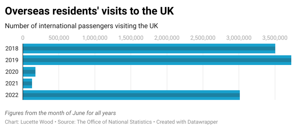 The number of overseas visitors to the UK in June was 3m, a decrease of 19% from June 2019 but an increase of 23% from May.