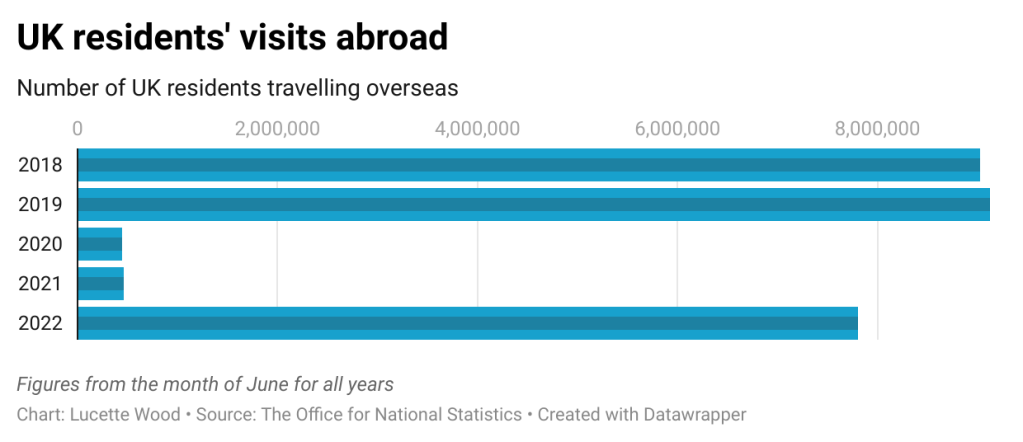 In June 7.8m Brits travelled abroad, a significant but expected increase from July 2021 which only saw 1.4m travel.